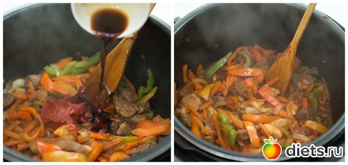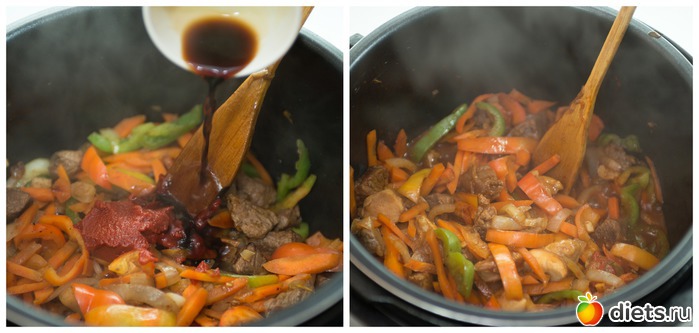 5. Добавляем томатную пасту, паприку и соевый соус, ещё раз перемешиваем и накрываем крышкой, тушим в течении 45 минут.