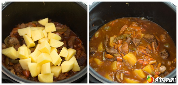 6. Картофель чистим и нарезаем крупными кусочками. Крышку мультиварки открываем и отправляем в рагу картофель, перемешиваем и возвращаем крышку на место. Готовим рагу в течении 30 минут.