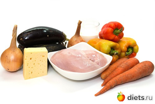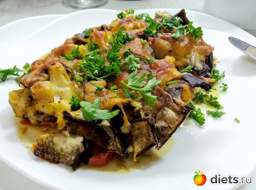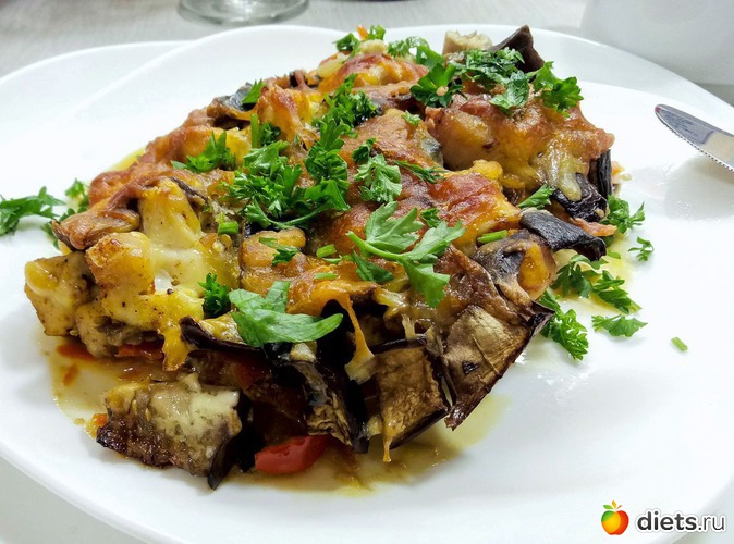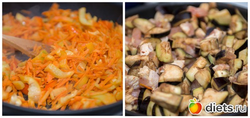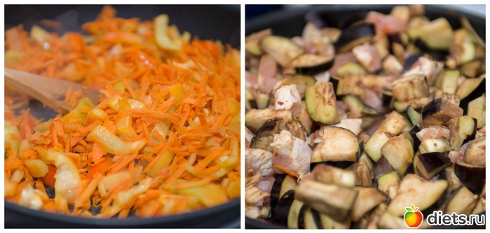 4. Тушим все вместе под закрытой крышкой, почти до готовности. Перекладываем в отдельную посуду. По истечении времени промываем баклажан от лишней соли и отправляем в сковороду, обжариваем до мягкости, сюда же кладем кусочки куриного филе, тушим до полуготовности.