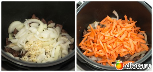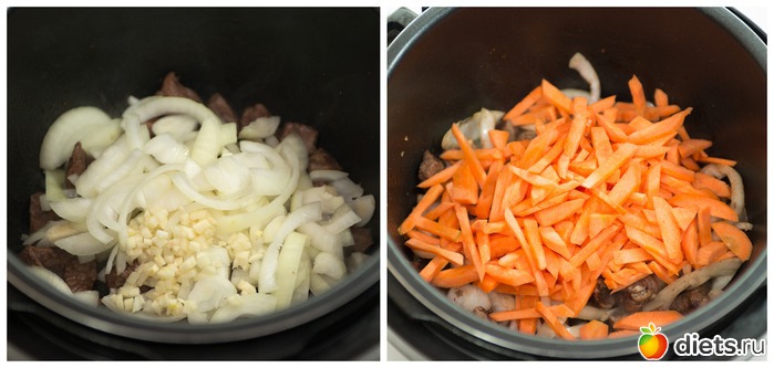 2. Лук чистим и нарезаем полукольцами, чеснок – мелкими кубиками. Добавляем в чашу немного растительного масла, отправляем лук с чесноком к мясу, обжариваем до золотистого цвета. После чего засыпаем сюда же морковку, очищенную и нарезанную брусочками.