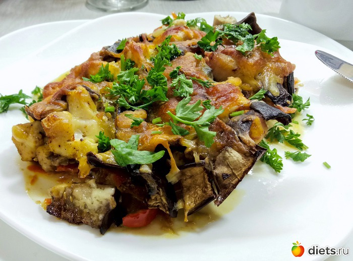7. Сыр натираем на мелкой терке, посыпаем им овощи сверху и ставим в разогретую до 200 градусов духовку. Накрываем форму крышкой (или фольгой) и запекаем около 50 минут, ориентируйтесь по своей духовке. За 15 минут до готовности снимаем крышку, как только сырная корочка станет золотисто-коричневой, духовку выключаем.
