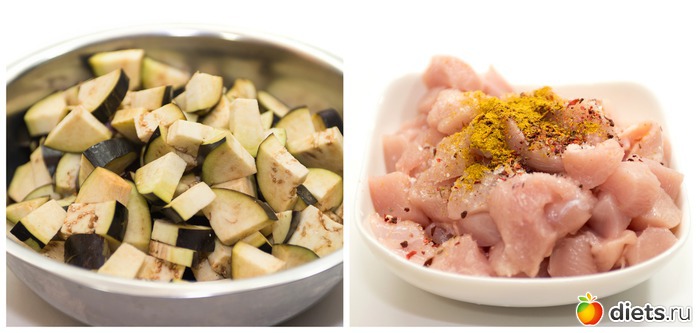 1. Баклажаны промываем, обтираем и нарезаем средними кусочками. Щедро посыпаем солью и оставляем минут на 30, чтобы избавиться от лишней горечи. Филе куриной грудки, без кожицы, также тщательно моем, обсушиваем и нарезаем кусочками, по величине, примерно, как баклажаны. Складываем в миску. Солим филе и посыпаем специями для курицы, оставляем на некоторое время.