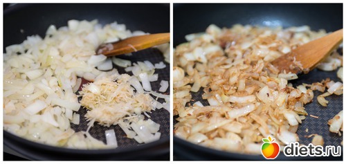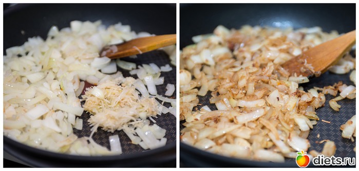 2. Лук чистим и нарезаем не очень мелко, чеснок давим через пресс или натираем на терке. Антипригарную сковороду разогреваем и смазываем каплей растительного масла. Обжариваем в ней лук и чеснок до золотистого цвета, выкладываем в отдельное блюдце.