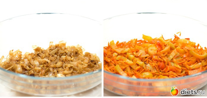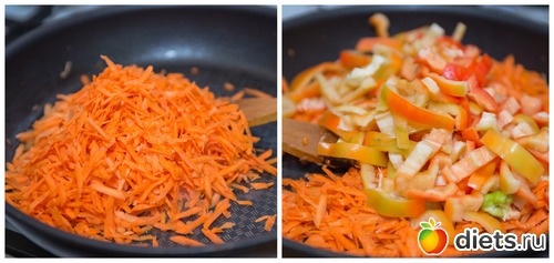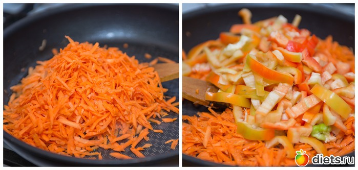 3. Морковь чистим и натираем на крупной терке. Промытый и обсушенный болгарский перец нарезаем полосочками, предварительно удалив из него семена. Сковороду снова смазываем каплей масла и отправляем в неё морковь, слегка обжариваем. Сюда же добавляем болгарский перец.