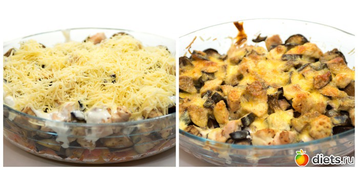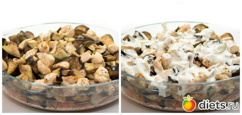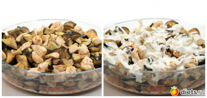 6. Следующим слоем выкладываем баклажан с курицей. Смазываем все сметаной.