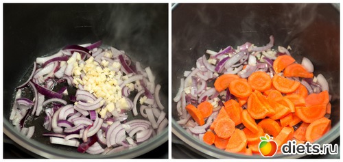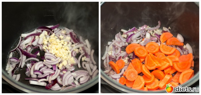 1. Разогреваем чашу мультиварки, смазываем её растительным маслом. Слегка обжариваем нарезанный четвертькольцами лук и мелкими кубиками чеснок. Морковь чистим, разрезаем вдоль на две части и нарезаем полукругами. Добавляем к луку с чесноком и обжариваем до золотистого цвета (4-5 минут), постоянно помешивая.