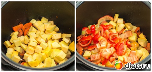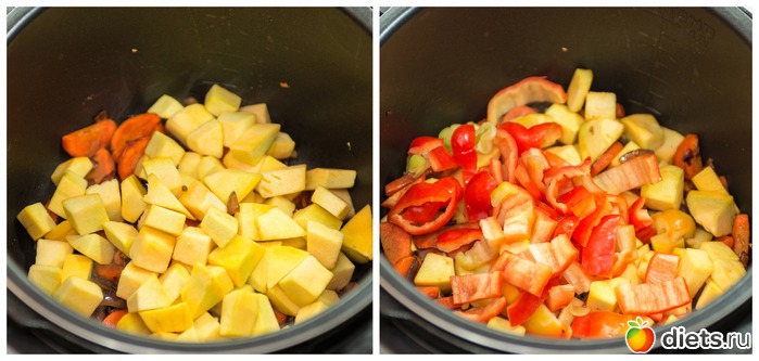 2. Теперь к овощам добавляем тыкву, нарезанную кусочками и очищенную от семян, нарезанный полосками сладкий перец, тушим все, помешивая около 5 минут.