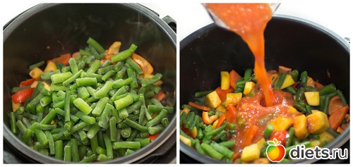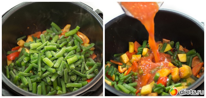 3. Сюда же всыпаем фасоль, снова перемешиваем. Помидор бланшируем, снимаем с него кожицу, взбиваем в блендере и вливаем к рагу.