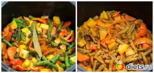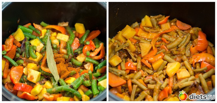 4. Добавляем лавровый лист, всыпаем паприку, перчим, перемешиваем. Готовим все под закрытой крышкой в течении 30 минут, после чего солим рагу, можно посыпать свежей зеленью и дать настояться минут 10-15.