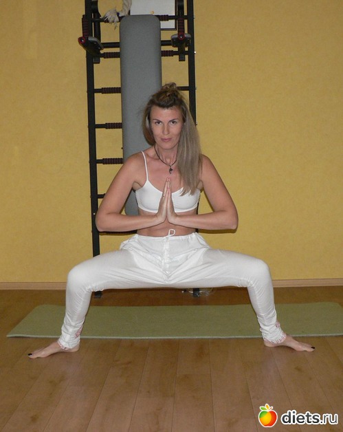 Для выполнения этой асаны расположите ноги шире плеч, стопы разверните в стороны, ладони соедините в намасте. Согните ноги в коленях и опустите ягодицы вниз до тех пор, пока бедраивае не выйдут в параллель с полом и не образуют прямой угол с голенью.