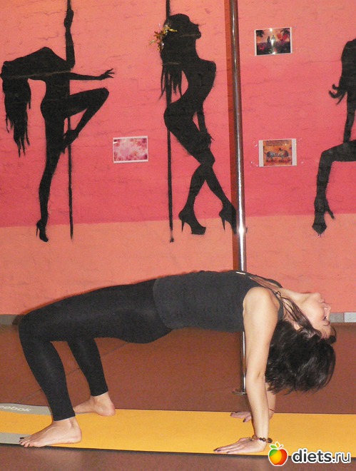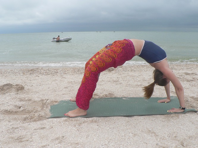 Со временем вы можете усложнить выполнение чакрасаны поднятой вверх прямой ногой или смещением опоры с ладоней на локти.