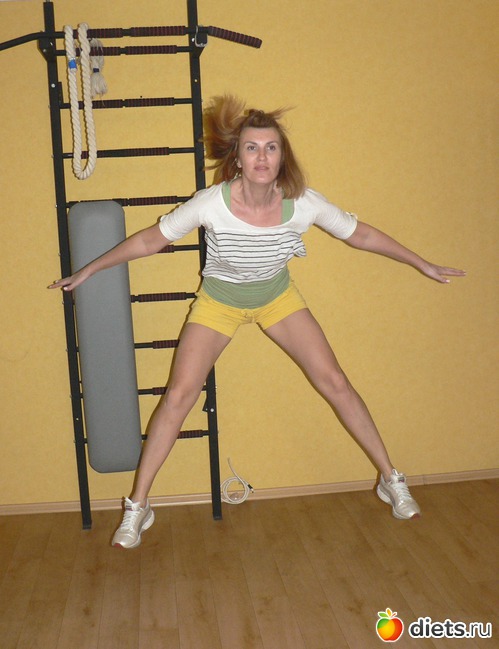 В качестве разминки, чтобы разогреться, выполните 20 прыжков на месте. Подпрыгивая вверх, разводите прямые ноги и руки в стороны.