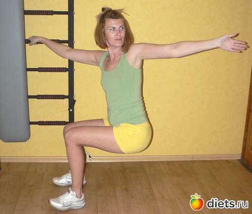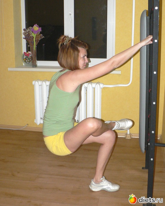 упражнение № 1 на все времена – это приседания. Классические приседания вы можете усилить разворотами корпуса вправо-влево. Не забывайте – приседая, необходимо бедра располагать параллельно полу и стараться, чтобы колени не выступали за линию больших пальцев ног. В противном случае, ваши коленные суставы получают ненужную избыточную нагрузку и быстро изнашиваются. Если вам сложно держать равновесие, используйте во время приседаний тренировочные петли или опирайтесь руками на спинку стула, перекладину шведской стенки и т.п.