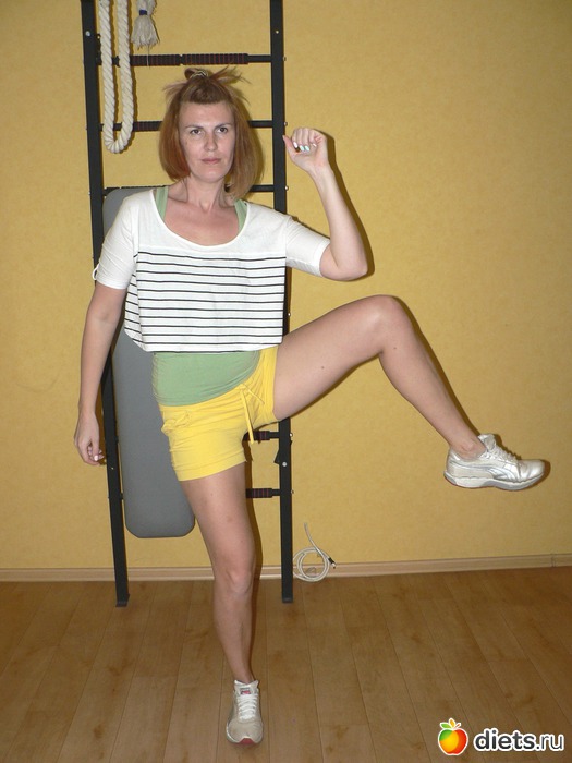 Упражнение № 3 в нашем рейтинге – махи ногами. В положении «стоя» эффективна связка из следующих махов: согнутой в колене ногой вперед, прямой – в сторону. Рекомендуемое количество повторов – по 20 раз с каждой ноги.