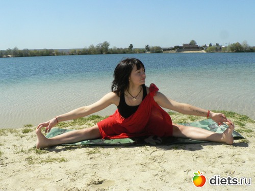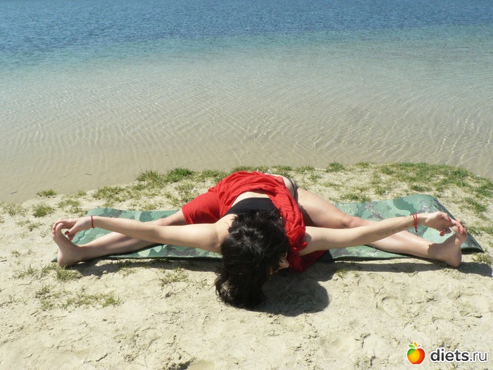 Еще больше наклонитесь вперед, потянитесь в пол грудью. Оставайтесь в асане в течение 1 минуты.