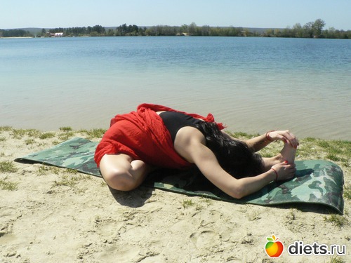 Наклонитесь к колену правой ноги, постарайтесь ладонями обхватить ее стопу. Оставайтесь в асане в течение 1 минуты, а затем повторите ее с другой ноги. Поза снимает нервозность, усталость, головную боль и менструальные боли, а также обеспечивает растяжку плеч, позвоночника, бедер и паховых мышц.