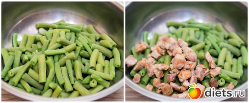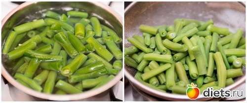 1. Сначала необходимо подготовить фасоль. Для этого срезаем с каждой фасоли с обеих сторон концы, промываем, обсушиваем и крупно нарезаем. В кастрюле доводим до кипения воду, подсаливаем её и бросаем туда фасоль. Варим её в течении 2-3 минут, откидываем на сито или дуршлаг, чтобы стекла лишняя вода.