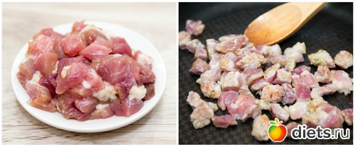 2. Свинину нарезаем мелкими кусочками и обжариваем на сухой сковороде практически до готовности. Если мясо совсем постное, смазываем сковороду каплей растительного масла. Так как мясо заранее мариновалось, его подсаливать не требуется.