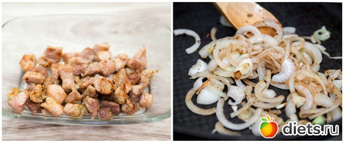 3. Перекладываем кусочки обжаренной свинины в тарелку, сковороду смазываем каплей масла и обжариваем в ней лук, нарезанный полукольцами, до золотистого цвета.
