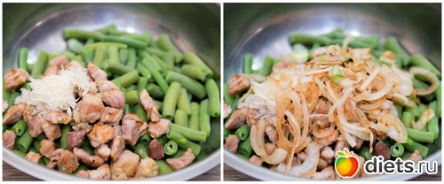 А мы хотим предложить очень вкусный вариант приготовления сытного обеда из стручковой фасоли, запеченной под хрустящей сырной корочкой. Мясо здесь можно использовать по желанию любое, либо даже бекон.