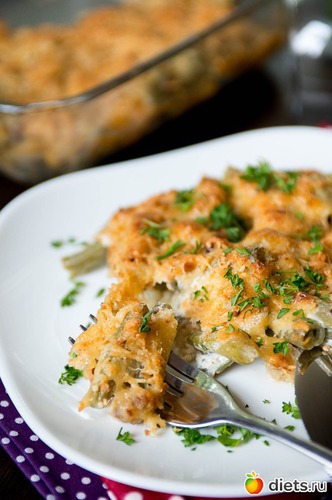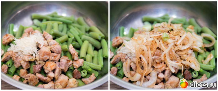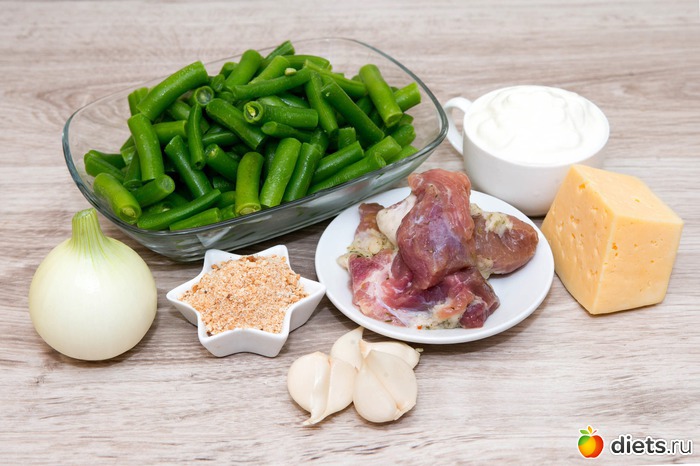 А мы хотим предложить очень вкусный вариант приготовления сытного обеда из стручковой фасоли, запеченной под хрустящей сырной корочкой. Мясо здесь можно использовать по желанию любое, либо даже бекон.