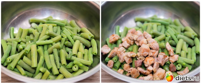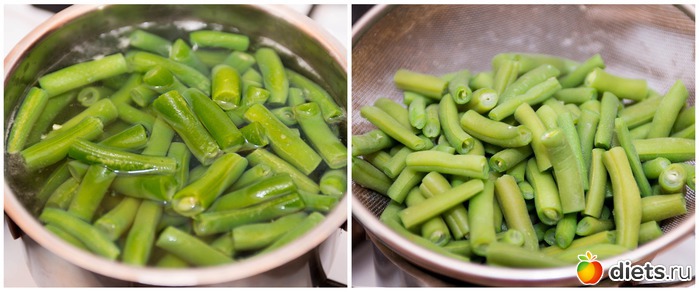 1. Сначала необходимо подготовить фасоль. Для этого срезаем с каждой фасоли с обеих сторон концы, промываем, обсушиваем и крупно нарезаем. В кастрюле доводим до кипения воду, подсаливаем её и бросаем туда фасоль. Варим её в течении 2-3 минут, откидываем на сито или дуршлаг, чтобы стекла лишняя вода.