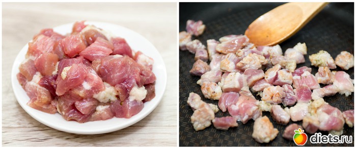 2. Свинину нарезаем мелкими кусочками и обжариваем на сухой сковороде практически до готовности. Если мясо совсем постное, смазываем сковороду каплей растительного масла. Так как мясо заранее мариновалось, его подсаливать не требуется.