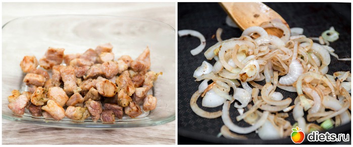 3. Перекладываем кусочки обжаренной свинины в тарелку, сковороду смазываем каплей масла и обжариваем в ней лук, нарезанный полукольцами, до золотистого цвета.