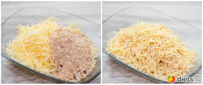 7. Сыр натираем на терке и смешиваем с панировочными сухарями.