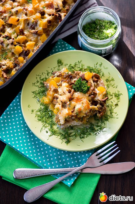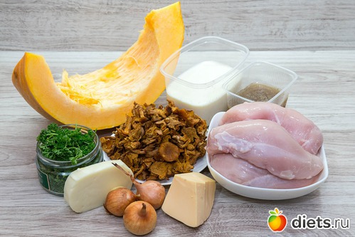 В 100 г готовых куриных отбивных с лисичками и тыквой содержится 130 ккал: белки - 14 г, жиры - 6 г, углеводы - 5 г.
