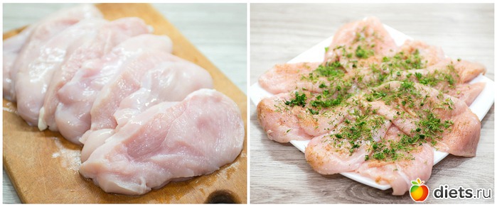 1. Куриное филе тщательно промываем и обсушиваем, нарезаем каждое филе вдоль на 2-3 части, слегка отбиваем, солим, перчим, посыпаем специями для курицы и мелко рубленной зеленью петрушки, оставляем на некоторое время.