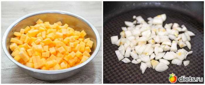 2. Тем временем, с тыквы срезаем кожицу и удаляем семечки, нарезаем на кубики, примерно, 1х1 сантиметр. Репчатый лук чистим и измельчаем. Сковороду разогреваем и смазываем каплей растительного масла, слегка обжариваем в ней лук.
