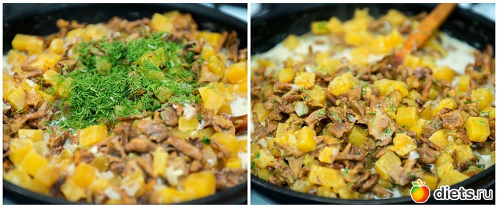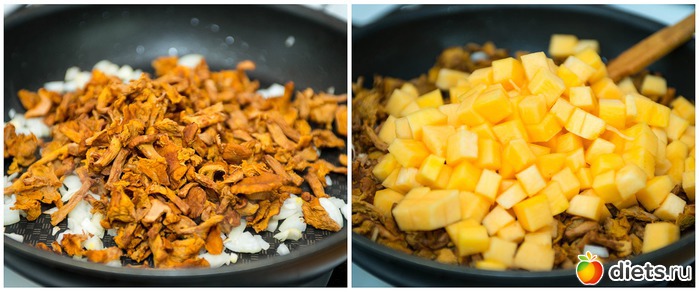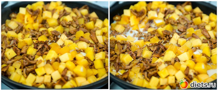 3. К луку добавляем грибы и тыкву.