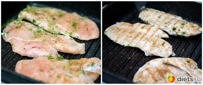 6. Филе куриной грудки обжариваем на хорошо прогретой сухой сковороде гриль (можно на обычной, антипригарной) с обеих сторон, почти до готовности.