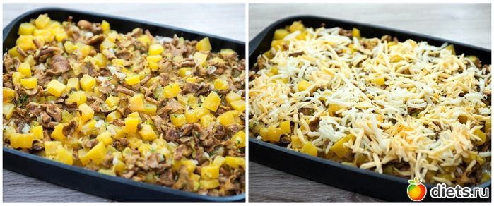 7. В подготовленную жаропрочную форму укладываем в один слой куриное филе, сверху распределяем начинку из овощей и грибов. Посыпаем все двумя видами сыра, натертыми на терке.