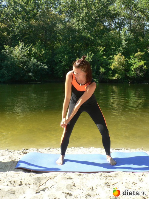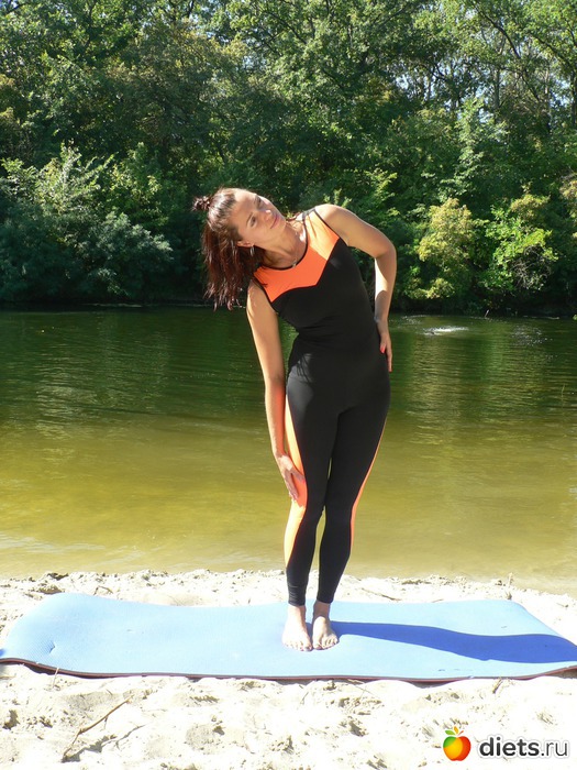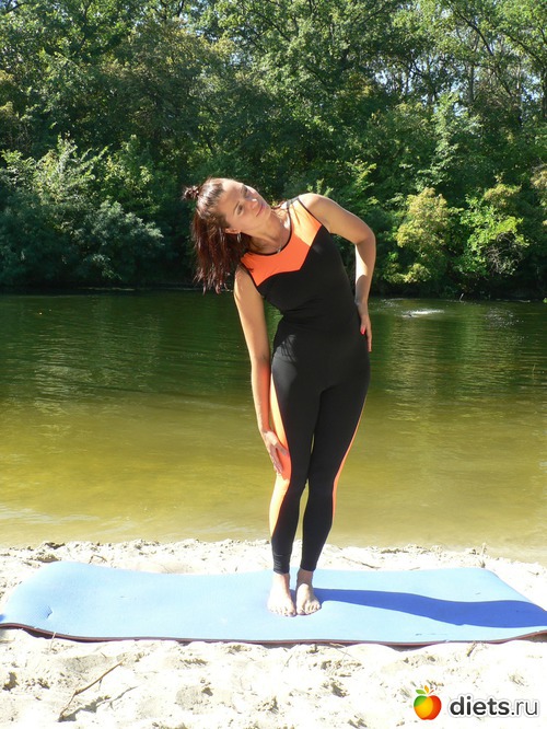 Начнем в положении стоя, ноги - вместе, руки - вдоль туловища. Наклонитесь вправо, потянитесь рукой как можно больше вниз. Выпрямитесь. То же движение проделайте влево.