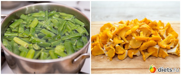 1. Для начала подготовим фасоль и грибы. Фасоль ополаскиваем, если она не мороженая, разрезаем попрек на кусочки длиной 3 см, и отвариваем в кипящей воде минуты 2-3, затем откидываем на сито. Лисички перебираем, тщательно промываем под проточной водой и, если они крупные, нарезаем кусочками, не мелко.
