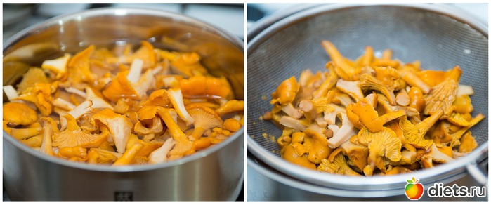 2. В небольшой кастрюле доводим до кипения воду, подсаливаем и отвариваем грибы в течении 15 минут. Откидываем на сито, чтобы стекла вода.
