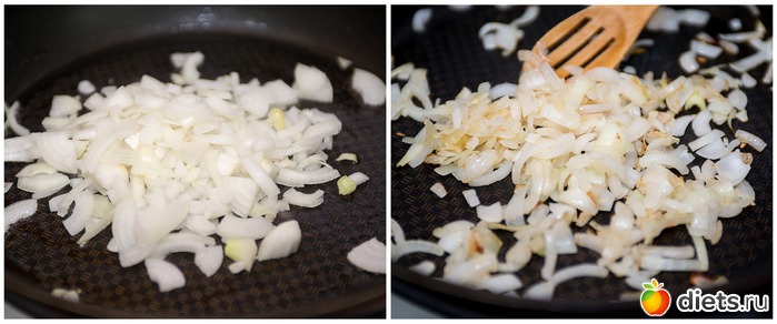 3. Репчатый лук чистим, шинкуем и обжариваем на сковороде, смазанной растительным маслом, до золотистого цвета.