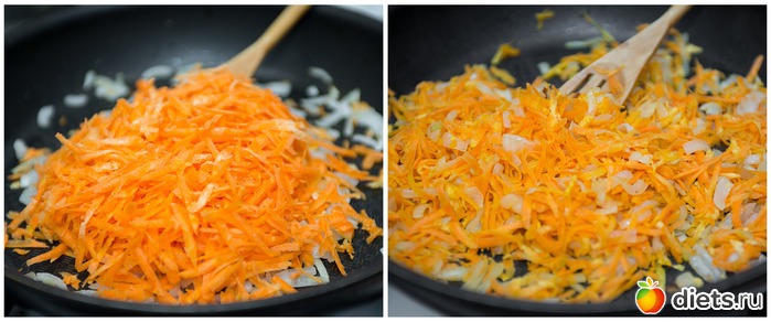 4. Морковь чистим, натираем на терке и отправляем к луку, тушим все вместе до мягкости моркови. Перекладываем морковь с луком в тарелку.