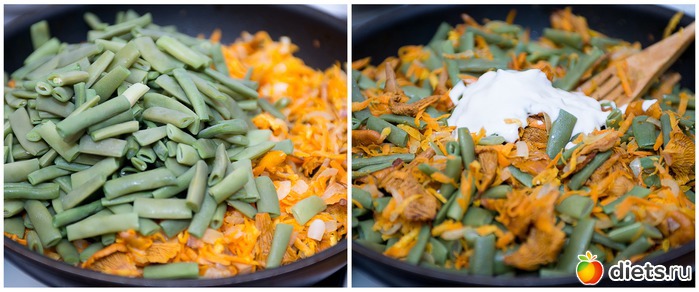 6. В сковороду к грибам с овощами, добавляем отваренную фасоль, посыпаем грибными приправами, солим и тушим все вместе минут 7. Заправляем блюдо сметаной.