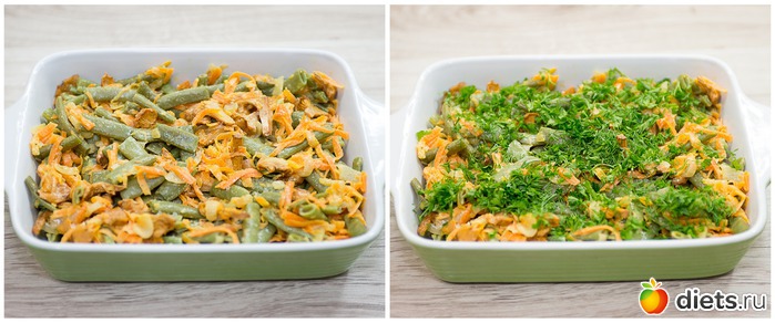 8. Перекладываем овощи с грибами в жаропрочную форму, разравниваем, посыпаем зеленью по вкусу.