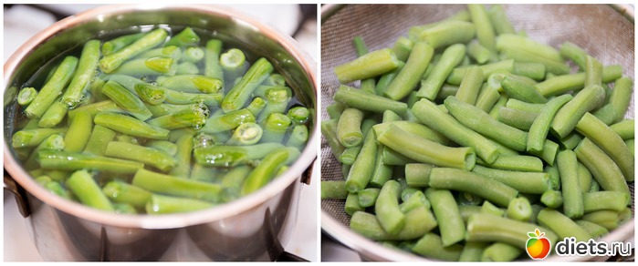1. Фасоль промыть, воду слить, если требуется, порезать стручки вдоль длиной, примерно, по 3 см, отварить в подсоленной воде пару минут, процедить.
