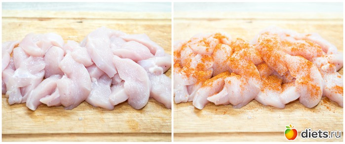 2. Филе куриной грудки также тщательно промываем и обсушиваем. Нарезаем филе кусочками либо полосками, посыпаем специями и солью, оставляем на некоторое время.