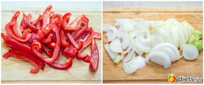 3. Перец чистим от семян и удаляем плодоножку, нарезаем полосками. Лук нарезаем полукольцами.