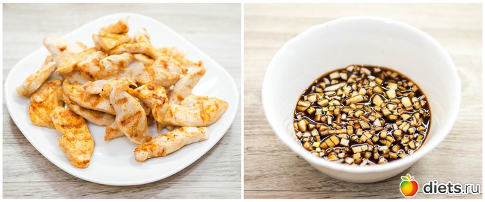 5. Перекладываем куриное филе на тарелку. Приготовим соус. Чеснок измельчаем мелкими кубиками, либо выдавливаем через пресс и смешиваем с соевым соусом, заправка готова.