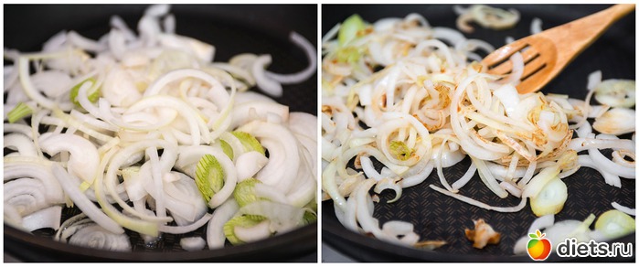 6. Антипригарную сковороду смазываем небольшим количеством оливкового масла и обжариваем в ней полукольца лука до золотистого цвета.
