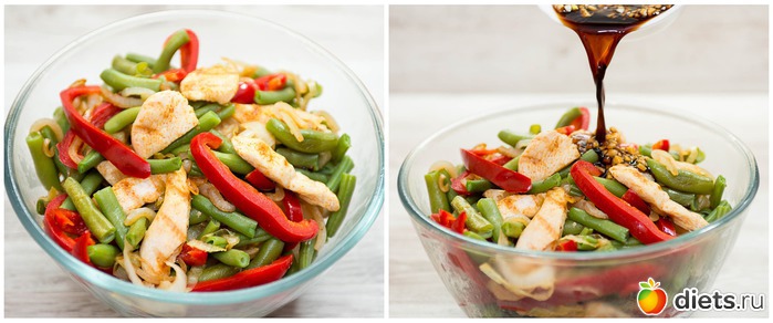 9. Выкладываем овощи с куриным филе в салатник и поливаем соусом.