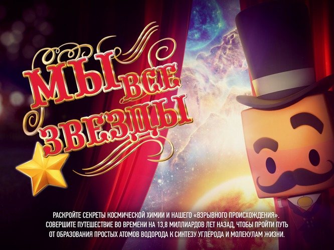 Полнокупольный фильм «Мы все звезды» раскрывает секреты космической химии и нашего «взрывного происхождения». Зрители совершают путешествие во времени и переносятся на 13,8 миллиардов лет назад, чтобы пройти путь от образования простых атомов водорода к синтезу углерода и молекулам жизни.