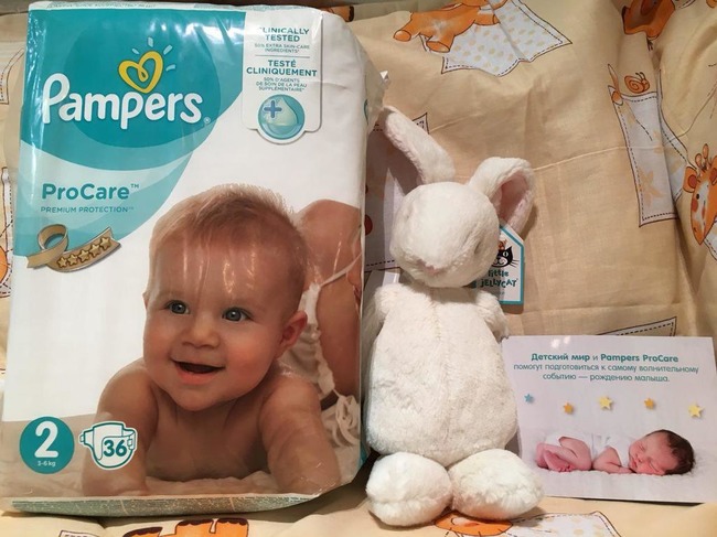 - Упаковки Pampers ProCare (вес ребенка до 9 кг) или другие подгузники Pampers (если вес ребенка от 9 до 16 кг), максимальный размер подгузников - на ребенка весом 16 кг